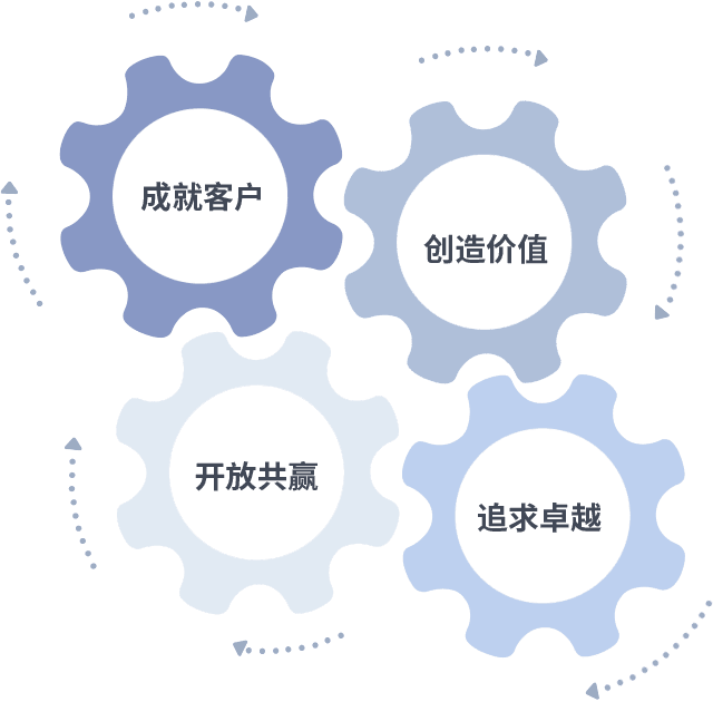 成就客户是一切决策的出发点,,创造价值是衡量所有工作的标准,,,追求卓越是我们做事做人的态度,,,,开放共赢是我们的格局也是最终的结果。。价值观的齿轮环环相扣,,,推动着组织里的每个人不断向前。。
