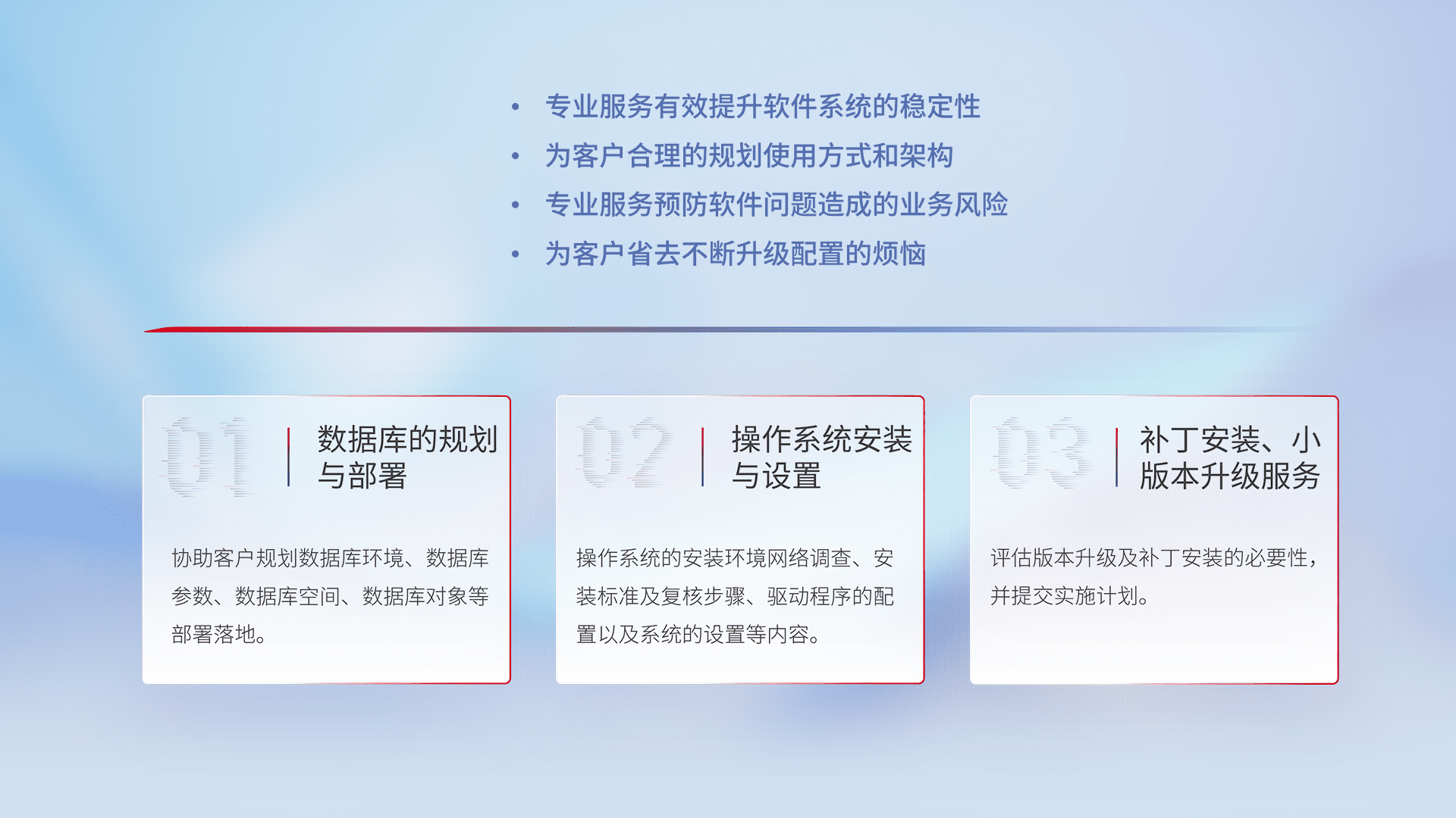为客户提供软件规模升级、、快速部署、、、、按需配置的专业服务,,,,从数据库的规划与部署到操作系统的安装与设置,,再到补丁安装和小版本升级提供支持。。。。